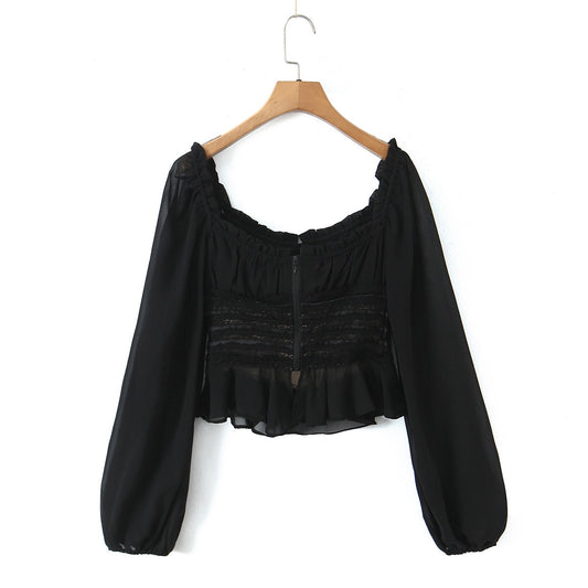 Pure Desire Wind Petal Round Neck Lace Splicing Shirt