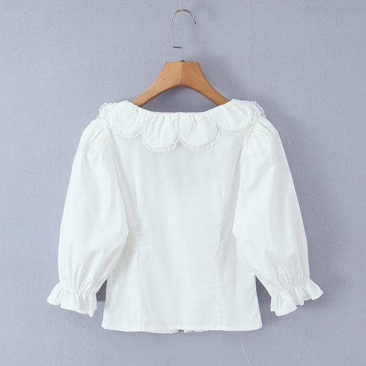 Retro lace collar with bubble sleeves slim fit single breasted top