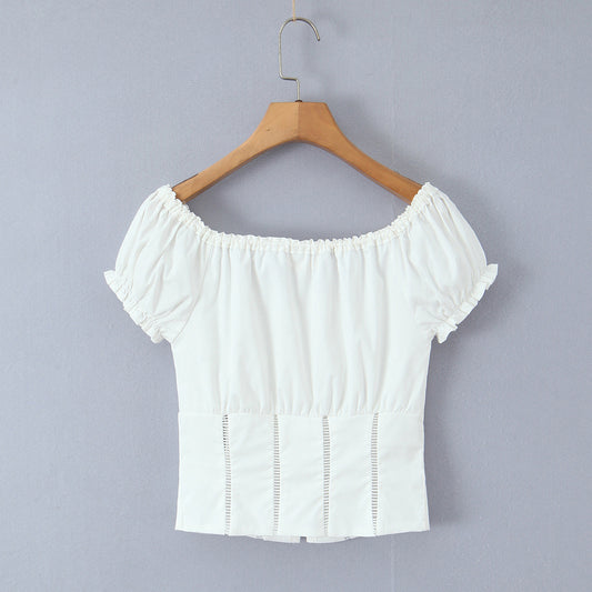 Vintage style black fungus lace up hollow lace short sleeved top