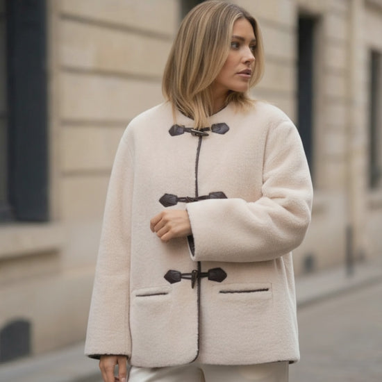 Make a statement with this stunning Buckled Fur Jacket in warm apricot. Designed for the modern woman, this jacket combines soft texture with sharp style—the signature buckled details catch the light beautifully whilst the round neckline and long sleeves create an effortlessly chic silhouette.
